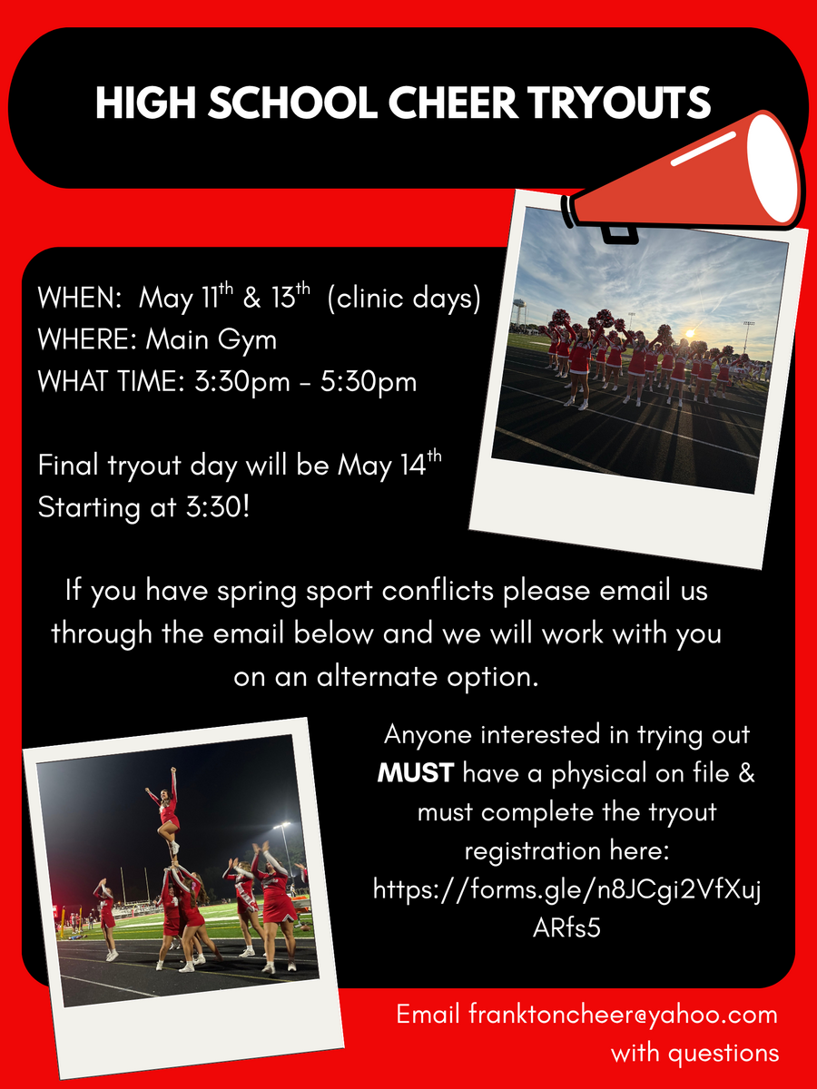 Good morning!Please see the attached flyer for the upcoming High School Cheer Tryouts being held on May 11 & May 13 in the main gym 3:30pm-5:30pm and final tryout on May 14 in the main gym star...