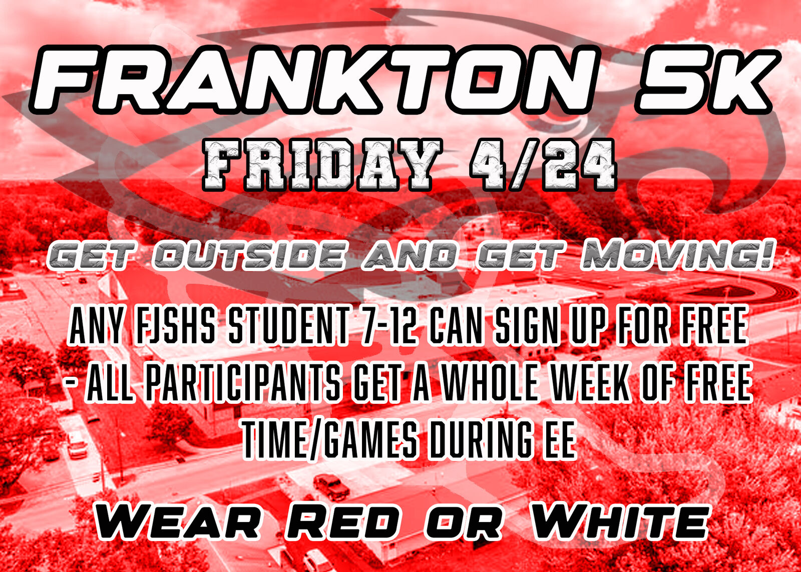 The Frankton Health Club is hosting a FREE run/walk 5K this Friday April 24 for all students. Permission forms will be coming home this week for your student to participate. We ask students partici...